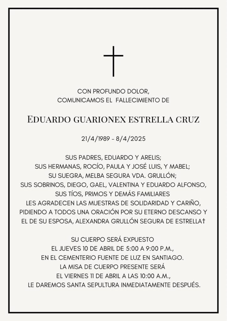Los familiares y seres queridos de Eduardo Guarionex Estrella Cruz, quien falleció el 8 de abril de 2025, informan que su cuerpo será expuesto el jueves 10 de abril, de 5:00 p.m. a 9:00 p.m., en el Cementerio Fuente de Luz en Santiago.
