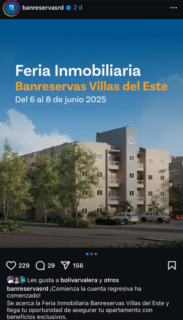 «¡Comienza la cuenta regresiva ha comenzado! Se acerca la Feria Inmobiliaria Banreservas Villas del Este y llega tu oportunidad de asegurar tu apartamento con beneficios exclusivos», posteó el reservas en su cuenta de Instagram.m