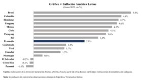 De acuerdo al informe, para junio de 2025 la República Dominicana mostró una inflación del 3.6%. En el mismo período, Brasil registró el nivel más alto de inflación, con un 5.4%, seguida por Colombia y Honduras, con un 4.8%, y 4.7% respectivamente.
