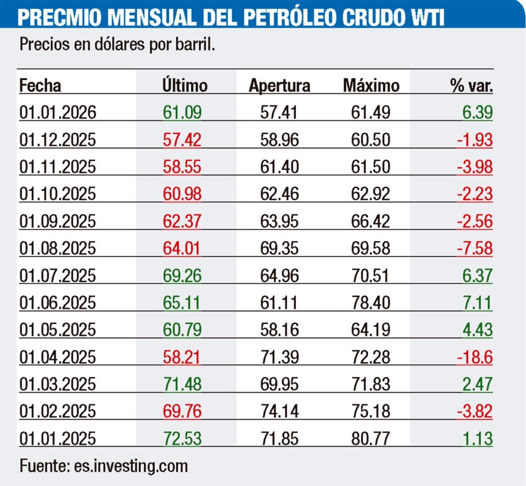 ¿Cómo pasó el barril de crudo del indicador de Texas (WTI) de un costo promedio mensual de US$72.53, en enero de 2025, a US$61.63 en igual mes de este año? La reducción fue de poco más de US$10.9, lo que significa una rebaja relativa de un 15%.
