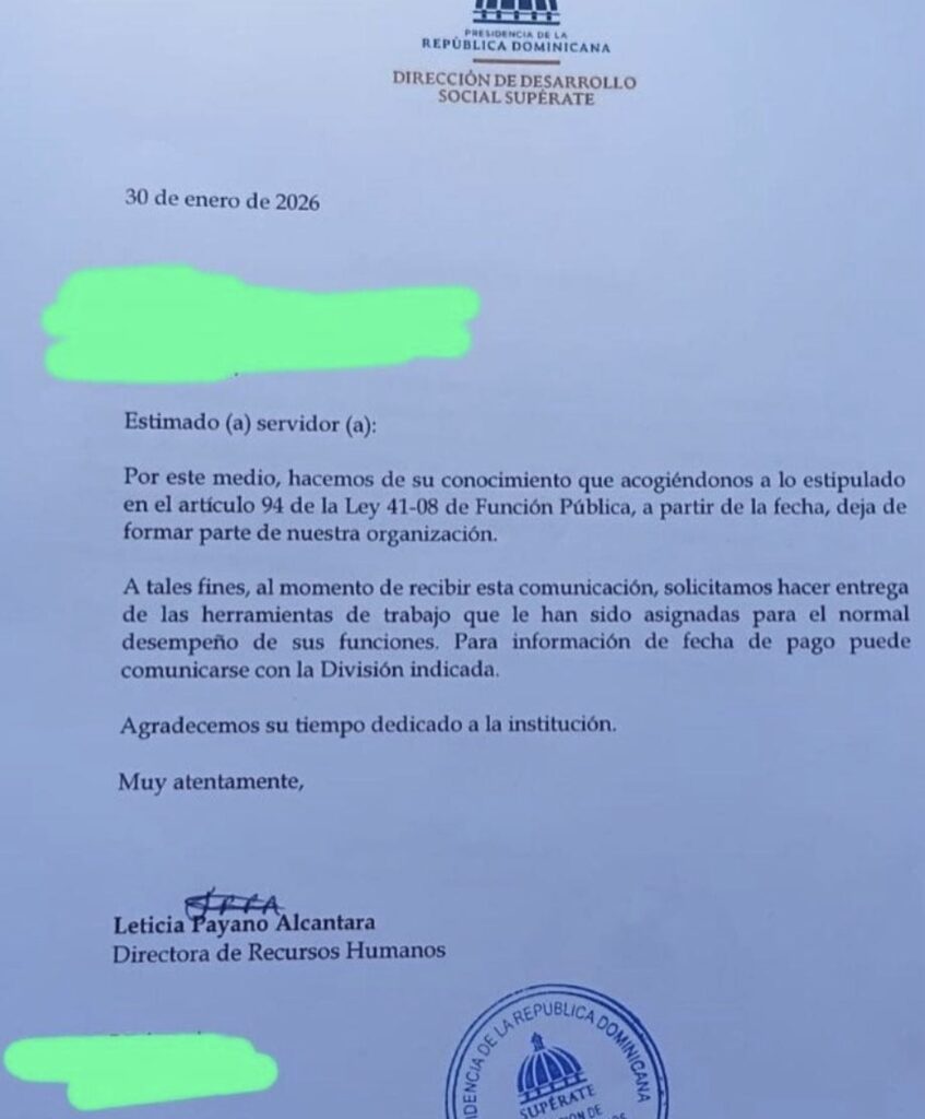 Santo Domingo.- A pocos días de asumir la dirección de la Dirección de Desarrollo Social Supérate, Mayra Jiménez enfrenta señalamientos por una serie de desvinculaciones que empleados describen como una cancelación masiva. De acuerdo con los testimonios, las separaciones ya superan las 100 personas y se habrían realizado presuntamente sin justificación.