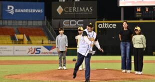 Leonardo Aguilera lanza la primera bola en partido inaugural del torneo de béisbol en el Estadio Cibao