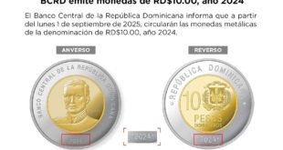 El Banco Central de la Republica Dominicana informa que a partir del lunes 1 de septiembre de 2025, circularán las monedas metálicas de la denominación de RD$10.00, año 2024. El BCRD indica que las monedas de esta denominación correspondientes a años anteriores mantendrán su fuerza liberatoria para el pago de todas las obligaciones públicas y privadas.