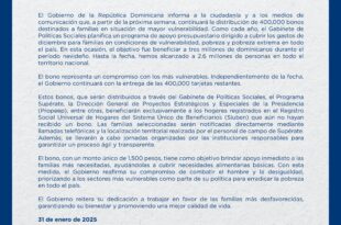 Santo Domingo, 31 de enero, 2025.- El Gobierno dominicano, a través de un comunicado de prensa, …